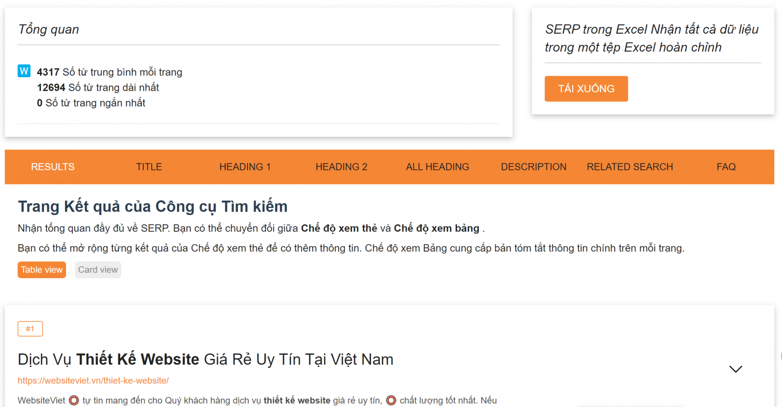 - Đánh giá chi tiết từng trang của SERP: Title, Meta description, kết quả tìm kiếm của google, tổng hợp các thẻ heading.